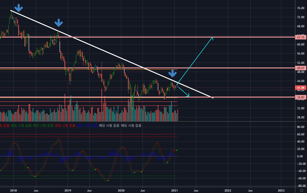 알트리아의 주봉으로 봤을 때 저항선에 맞닿아 있습니다. 현재 3~4트째인데 과연 저걸 뚫어낼지 다시 저항 맞고 꼬꾸라질지 확인하고 들어가시는 걸 추천드립니다.