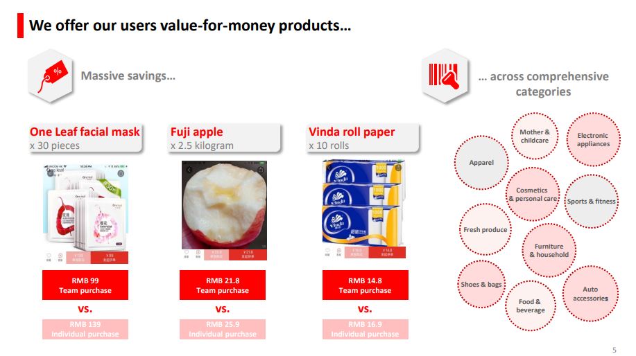 핀둬둬가 추구하는 대표적인 비즈니스 모델은 공동구매로 인해 많은 사람들이 상호작용을 하여 사용자들의 구매 경험으로 인해 많은 인식과 신뢰를 쌓는 '재미있는 거래'와 생산량 감소 및 공급에 대한 동선을 줄여 많은 이용자들에게 싸게 물건을 공급하여 "많은 절약"을 주된 비즈니스 모델로 삼고 있습니다.