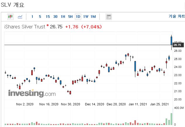 이번 게임스탑 주가폭등을 이끈 레딧의 월스트리트 베츠(투자게시판)를 살펴보시게 되면 미국의 실버 관련 ETF인 SLV 관련 글들도 게임스탑에 뒤이어서 많이 나오고 있는데요, 정부와 금융기관이 은 시세를 억누르고 있고, 대형은행들이 은 시세를 조작하니 은 ETF를 매입하게 되면 게임스탑 공매도 기관에 이어서 월스트리트의 대형은행에 피해를 줄 수 있다는 글이 작성되었습니다.