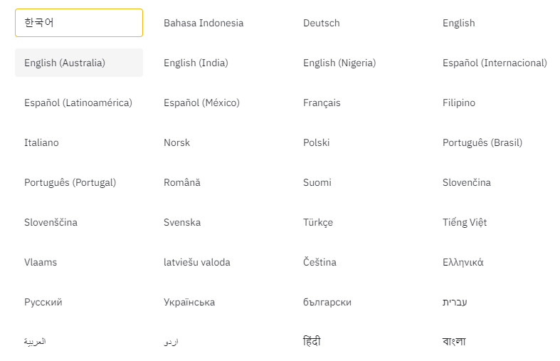바이낸스 거래소는 세계 1등 거래소답게 다양한 나라에서 이용되는 가상화폐 거래소 이므로 다양한 언어를 제공하는데요, 17년 이후 급증한 국내 가상화폐 거래량 탓인지 한국어도 지원하는 모습을 보여주고 있습니다.