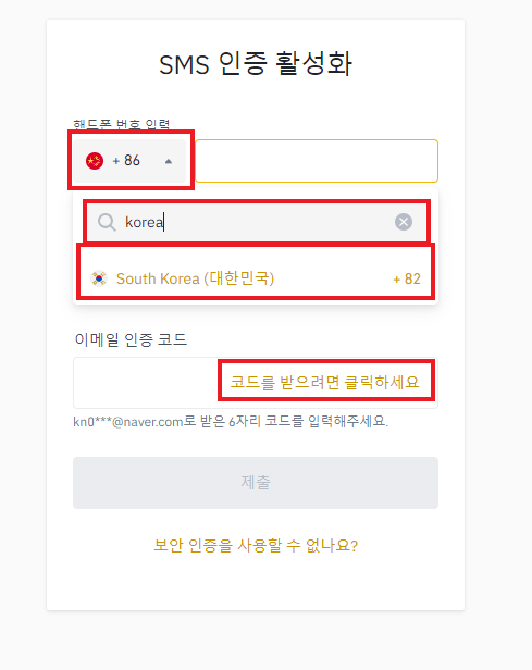 전화인증을 선택하게 되면 기본적으로 중국 국가번호인 +86으로 되어있을 텐데 클릭 후 'KOREA'를 기입하여 한국 국가번호인 +82를 선택한 후 문자 인증을 진행하시면 됩니다. 추가로 이메일 재인증도 같이 진행해주시면 됩니다.