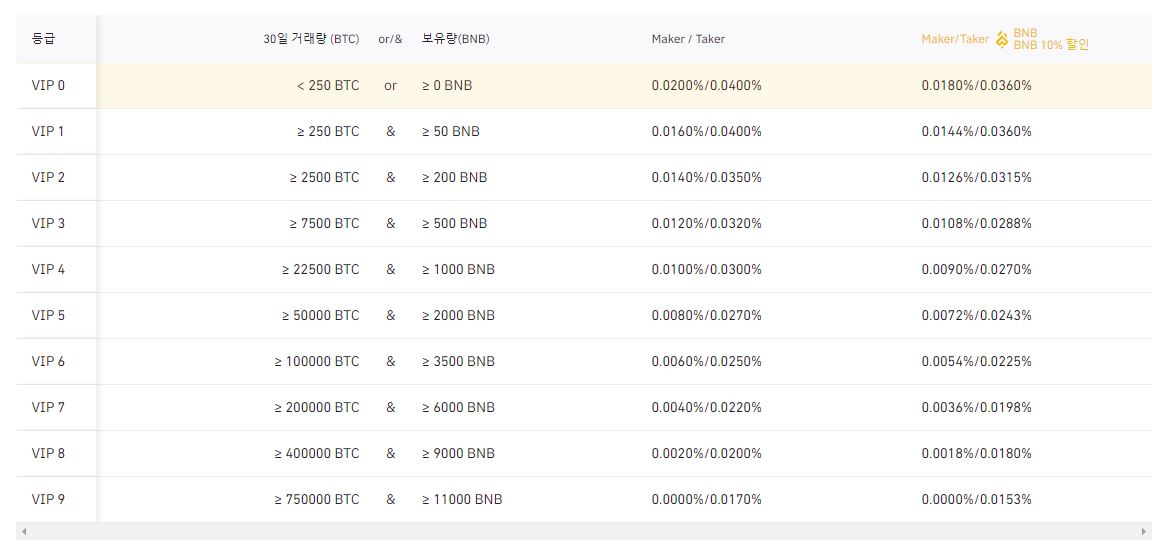 바이낸스 거래소는 국내 대표적인 가상화폐 거래소인 업비트와 빗썸에 비해서 수수료가 저렴한 편에 속합니다. 바이낸스의 경우 현물거래 수수료는 0.1%이며, 거래소 자체 코인인 BNB(바이낸스 코인)을 이용하면 수수료를 상당 부분 아낄 수가 있습니다. 추가로 테더 코인을 이용한 USDT 선물거래의 경우 수수료는 0.02% / 0.04%입니다.