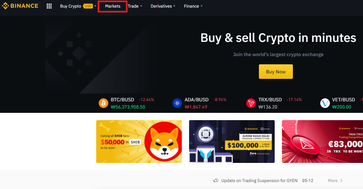 바이낸스 거래소에 입금을 완료 한 뒤 리플을 테더코인으로 바꾸기 위해서는 매인 화면에 다시 돌아와 상단에 있는 마켓 탭을 클릭해줍니다.