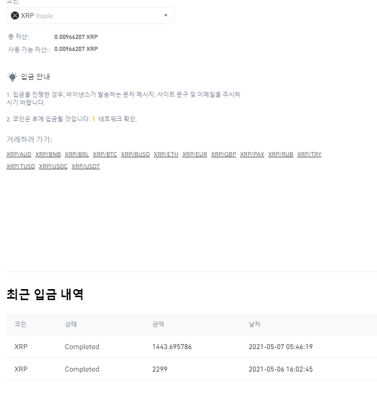 카카오페이 인증을 진행한 후 약 짧게는 2분 길게는 5분 정도면 바이낸스 지갑에 보냈던 코인들이 입금이 됩니다. 하지만 바이낸스에서는 주된 거래를 테더 코인(달러)으로 하기 때문에 리플을 테더 코인으로 바꿔주어야 합니다.