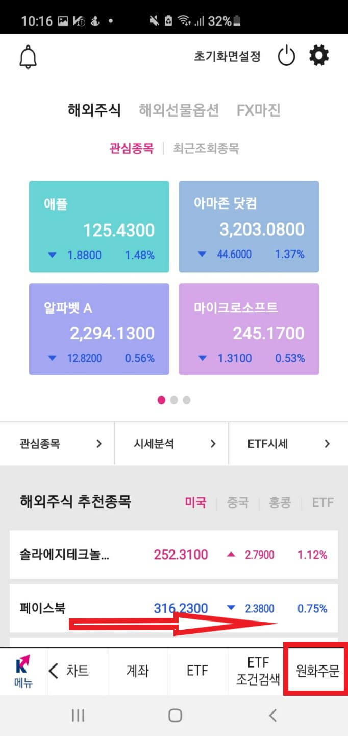 ▲키움증권 영웅문 글로벌 S 어플을 실행하시게 되면 위와 같이 초기화면이 뜨게 될 겁니다. 하단의 메뉴탭을 오른쪽으로 슬라이드 하여 "원화주문탭"을 찾아주시고 눌러주세요. 만약 슬라이드하여도 나오지 않는다면, 우측의 메뉴탭을 눌러 원화주문 탭을 찾아주시면 됩니다.