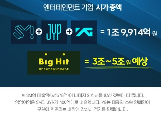 이는 엔터테인먼트 주요 3사(SM, JYP, YG)를 합한 것보다 더 크다고 합니다.
