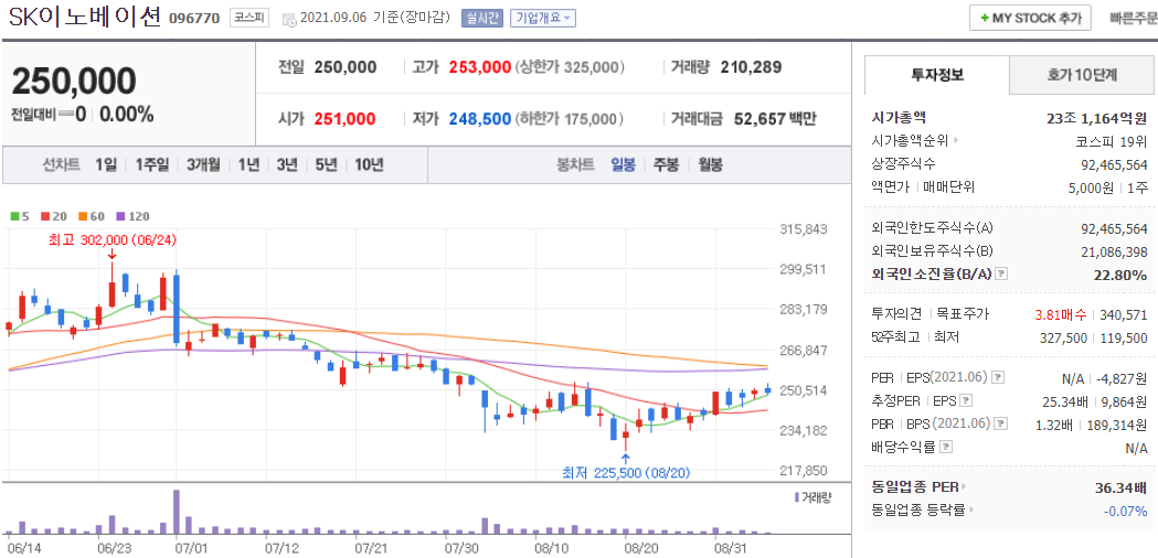 LG화학의 21년 2분기 실적 기준 전년동기대비 매출액, 영업이익, 당기순이익이 각각 54%, 356%, 593%가량 상승한 모습을 보여주었습니다. 하지만 위에 설명드렸듯이 리콜 및 화재와 같은 악재가 겹겹이 터지는 바람에 주가는 조정을 받고 있는 모습을 보여주고 있습니다.