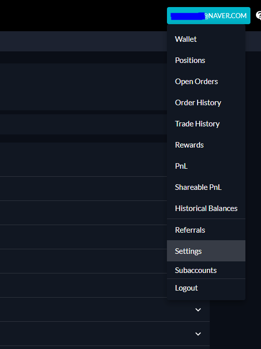 FTX거래소 메인화면으로 다시 돌아와 우측 상단에 있는 본인의 이메일에 마우스를 올리게 되면 아래와 같이 세부 메뉴들이 나오게 되는데, 제일 아래에서 3번째에 있는 'Settings'를 눌러주시면 됩니다.