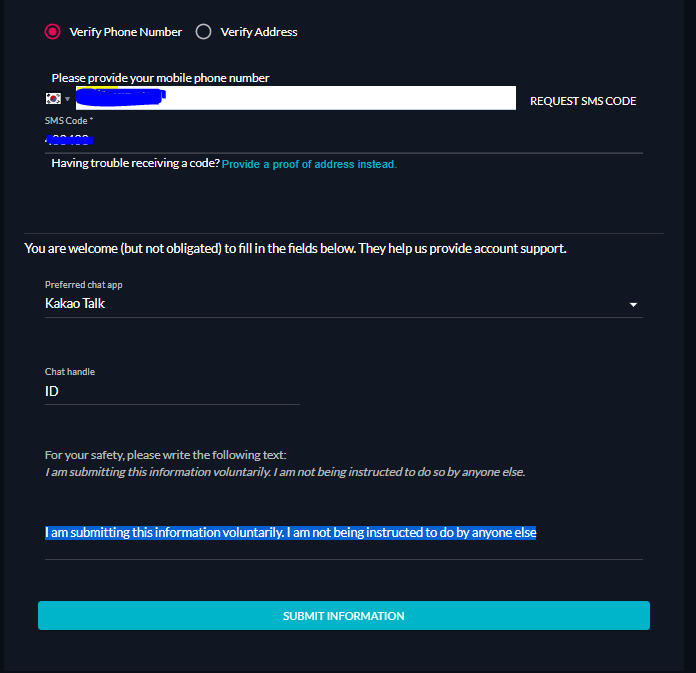 천천히 진행하여 주시고, 가장 마지막에 있는 'For your safety, please write following text'(당신의 안전을 위하여 아래의 텍스트를 작성하여주시기 바랍니다.)의 칸에 아래에 나타나 있는 문구를 기입하여야 신원인증이 가능합니다. 복붙이 불가능하므로 본인이 직접 입력하셔야 합니다. 영문만 입력하시면 됩니다.