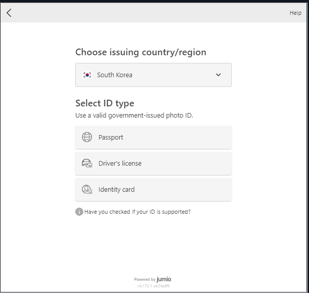쭈욱 진행하시다 보면 본인의 사는 나라 및 어느 것을 이용하여 본인의 신분을 증명할 것인지 고르는 창이 나타나게 됩니다. 지역의 경우 South Korea를 골라주시면 되고, 여권, 운전면허증, 신분증을 통하여 신분을 증명하실 수 있는데, 저 같은 경우에는 신분증으로 진행하였습니다.