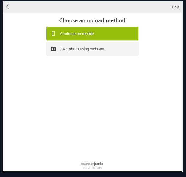 이후 기입을 완료하신 후 아래의 제출 버튼을 누르시게 되면, 자동으로 2차 인증으로 넘어가게 되는데, 아래와 같은 창이 새롭게 뜨실 겁니다. 어느 방법을 통하여 2차 신원인증을 진행할 것인지 묻는 창인데요, 웹캠 및 휴대전화로 가능합니다. 휴대전화로 진행하는 것이 덜 까다로우니 웬만해서는 'Countinue on mobile' 버튼을 눌러서 진행하시면 됩니다.