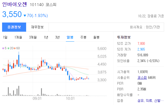 2021년 2분기 기준 인바이오젠 실적은 전년 동기 대비 매출액은 5%가량 감소하였고, 영업손실은 120% 증가하여 적자폭이 증가한 모습을 보여주었습니다.