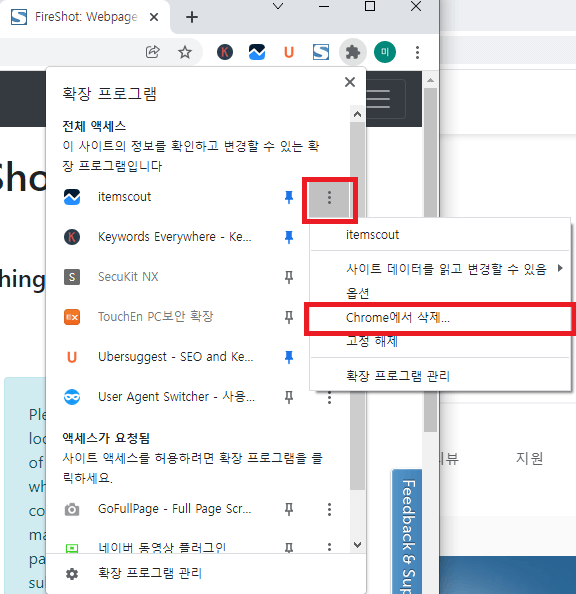 추가로 위의 확장프로그램 관리 메뉴에서 삭제하길 원하는 확장프로그램의 경우에는 삭제할 확장프로그램 탭 제일 우측에 있는 '점 3개' 버튼을 눌러 쉽고 간단하게 삭제가 가능합니다.
