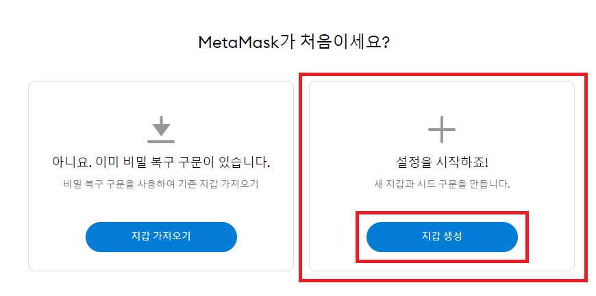 지갑 신규생성을 위하여 메타마스크 지갑 생성 버튼을 눌러주시면 됩니다. 다만, 이전에 메타마스크 지갑을 생성한 이력이 있다면 지갑 가져오기를 눌러주시면 됩니다.