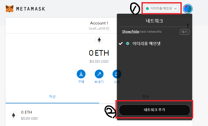 메타마스크 지갑 화면에서 우측 상단에 있는 표시된 곳을 눌러 '네트워크 추가' 버튼을 눌러 BSC연결과정을 진행하여 주시면 됩니다.