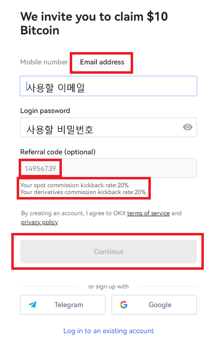 이메일 또는 휴대전화번호와 OKX 거래소에서 사용할 비밀번호를 기입하신 후 아래의 'Countinue' 버튼을 눌러 오케이엑스 거래소 가입을 계속 진행하시면 됩니다.