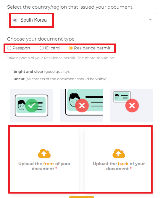 두 번째로는, 신원인증을 위한 신분 인증 과정인데요, 바이비트 신원인증의 경우에는 여권, 신분증, 거주 허가증(비자)을 통하여 신원인증이 가능합니다. 신분증 또는 여권을 통하여 바이비트 신원인증을 진행하시면 됩니다.