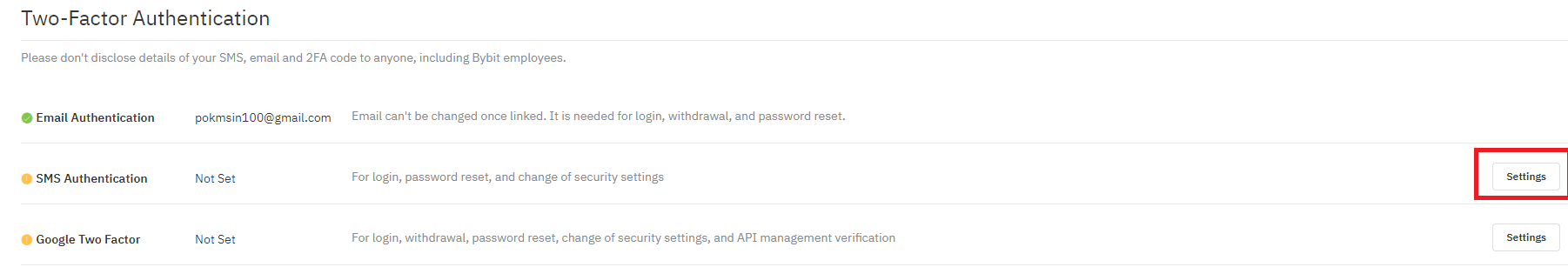 바이비트의 경우에는 입금은 상관이 없지만, 출금 과정에서 만약 2차 인증을 하지 않은 게정에 대해서 출금을 허용하고 있지 않습니다. 바이비트 2차 인증 시스템으로는 sms, 이메일, 구글 otp로 사용이 가능하며, 3가지 방법 중 한 가지를 선택하여 사용하시면 됩니다.