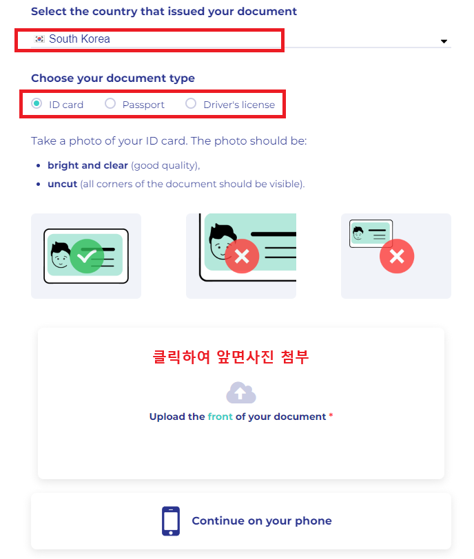 신원인증에 사용할 신분증을 선택하셨다면, 해당 신분증의 앞면을 촬영하여 아래의 업로드하는 곳을 클릭하여 업로드를 진행하시면 됩니다. 따로 사진을 옮기는 절차 없이 아래의 'Continue on your phone' 버튼을 눌러 휴대폰을 통하여 촬영 후 바로 업로드 절차를 밟을 수 있습니다.