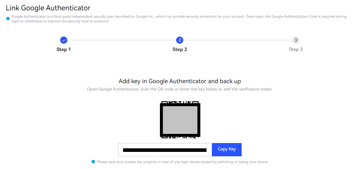 Google Authenticator App을 설치하셨다면, 해당 어플을 실행하신 후, QR코드를 스캔하시면 됩니다. 아래 KEY 코드는 혹시라도 이용자가 구글인증기를 부득이하게 사용하지 못할 때, 복구할 수 있는 복구키입니다. 본인의 휴대전화가 고장이 나도 확인할 수 있는 곳에 보관하는 것을 권장드립니다.