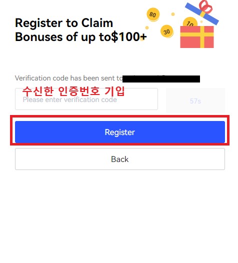 넥스트 버튼을 누르면, 기입한 이메일 또는 휴대전화로 인증번호가 수신이 됩니다. 수신한 인증번호를 기입하시고 아래의 'Register' 버튼을 눌러 계속 진행해 주시길 바랍니다.