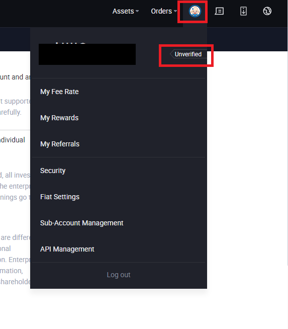 후오비 글로벌 거래소에 가입을 완료하셨다면, 우측 상단에 있는 아기 모양 아이콘에 커서를 올린 후 바로 아래의 'Unverified' 버튼을 눌러 신원인증 탭으로 진입하여 주시길 바랍니다.