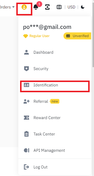 앞서 설명드린 방법으로 바이낸스 거래소 가입에 완료하였다면, 바이낸스 거래소 매인 홈피로 진입하여 우측 상단에 있는 아이콘에 커서를 올려 Identification 메뉴를 접근하여 신원인증을 계속 진행하여 주세요.