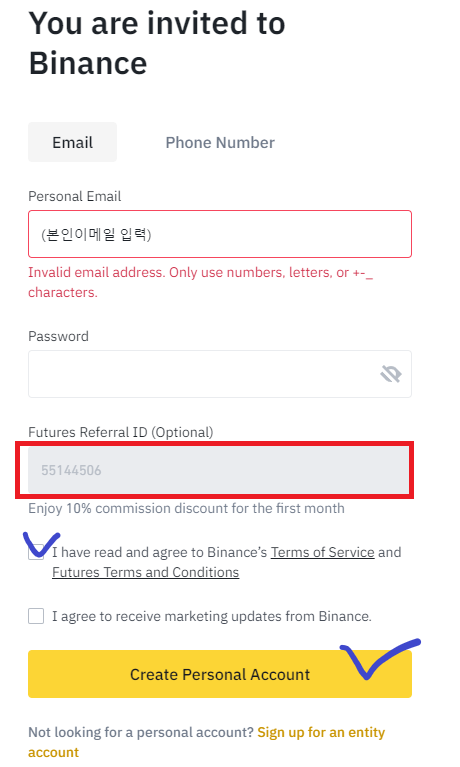 바이낸스 거래소 가입화면으로 진입하였다면, 위와같은 화면이 나오게 될 겁니다. 어려운 거 없이, 본인의 이메일 또는 휴대폰 번호를 기입하여 진행하여 주시면 됩니다.