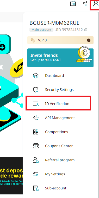 비트겟 회원가입을 완료하였다면, 비트겟 거래소 메인화면으로 접속해 우측 상단에 있는 사람모양 아이콘에 커서를 올려 'ID Verification' 메뉴에 접근하여 신원인증을 진행해 주세요.