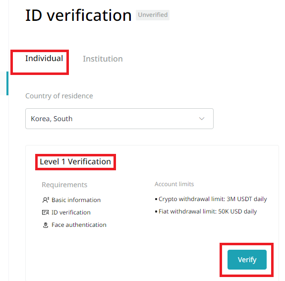 KYC 인증 종류에는 개인회원, 기업회원이 나뉘어져 있습니다. 개인회원(Individual) 을 선택하시고 나라를 'Korea, South'를 맞춰서 계속 진행하시면 됩니다.