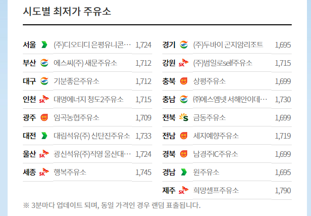 또한 메인메뉴에서 시도별 최저가 주유소를 확인할 수 있습니다. 시도별 최저가 주유소 가격 비교 메뉴에서도 지역별로 1~2%, 크게는 5%까지 차이나는 경우를 확인 할 수 있습니다.