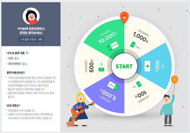 네이버 지식인의 경우에는 지식iN 질문, 답변 활동에 따라 발급된 이용권으로 경품을 받을 수 있는 룰렛 서비스입니다. 주로 네이버 페이 포인트나, 내공지수를 상품으로 받을 수 있습니다.