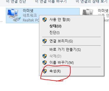 본인이 사용하고 있는 주 인터넷 네트워크를 선택 후, 우클릭 - 속성 버튼을 눌러주세요.