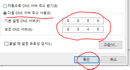 눌렀다면, 오른쪽 사진과 같이, '다음 DNS 서버 주소 사용' 선택 후, 기본 설정 DNS 서버에 8.8.8.8, 보조 DNS 서버에 8.8.4.8을 입력하시고, 확인 -> 적용 버튼을 눌러주세요.