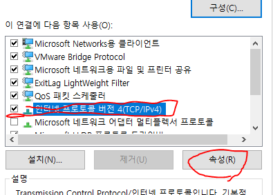 '인터넷 프로토콜 버전4(TCP/IPV4)'를 지정해주고, 아래에 있는 속성 버튼을 눌러 주세요.