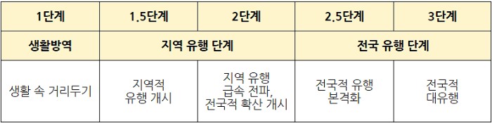 3단계의 경우 2단계를 지나 전국적 유행이 본격화가 이루어질 때 사회적 거리두기 3단계를 적용합니다.