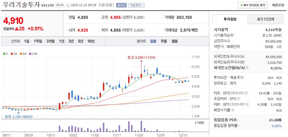 '우리 기술투자'의 시가총액은 4116억 원이며, 배당금은 지급되지 않습니다.