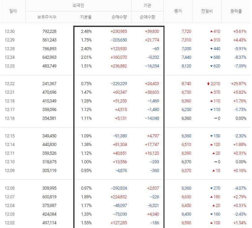 최근 외인들과 기관에서 현대약품을 지속적으로 매입하는 모습을 볼 수 있습니다 보유주식수가 한 달 사이에 약 40~50만 주 증가한 79만을 기록하기도 하였는데요, 지분율로 봤을 때는 0프로대에서 2프로 중반대까지 급격하게 매수하는 모습을 보여주고 있습니다.
