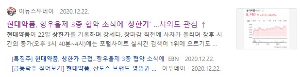 현대약품이 12월 22일 상한가를 기록하기도 하였는데요, 이날 상한가를 기록하게 된 가장 큰 이유가 현대약품이 한국 산도스의 CNS 약물인 항우울제 관련 3개의 의약 브랜드에 대하여 공동 프로모션을 진행함에 따라 이러한 기대감에 상한가를 기록하기도 하였습니다.