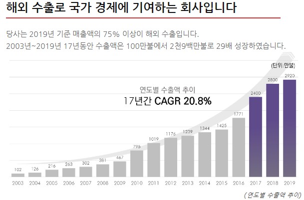 선전 뷰티사이언스는 연도별 매출, 연도별 수출액 추이가 꾸준하게 상승하는 모습을 보여주고 있습니다. 추가로 국내 최초로 2019년 11월 화장품 소재업 체중 첫 번째로 FDA 심사를 통과한 기업으로도 알려져 있습니다.