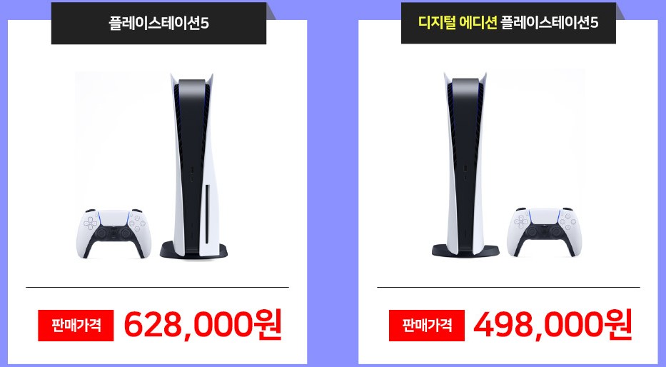 이번 PS5 사전예약 6차에서는 플레이스테이션 5 모델과 플레이스테이션 5 디지털 에디션 총 두 가지 모델을 사전예약을 받을 예정인데요, 가격은 각각 628,000원, 498,000원으로 약 13만 원가량 차이가 납니다.