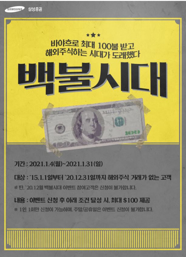 예전에 제가 증권사 계좌개설할때는 키움증권 40달러 이벤트가 제일 혜자 이벤트였는데요, 이번에 제가 증권사 이벤트 자료조사를 하면서 삼성증권에는 최대 100불까지 지급을 하더라고요,