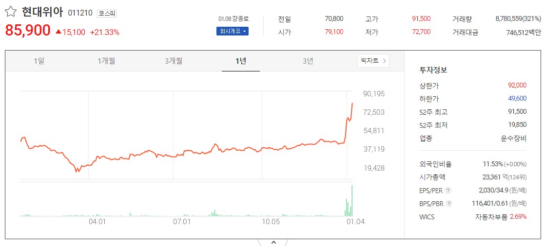 현대위아는 현대차 그룹의 계열사 중 하나인데요, 주로 자동차 부품의 개발 및 생산을 담당하는 계열사입니다. 이러한 현대위아는 애플카의 수혜를 제대로 받은 기업인데요, 지난 8일 21프로 가까운 주가 상승을 보여주기도 하였습니다.