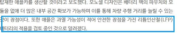 파워넷이 애플카 관련주로 꼽히게 된 이유에는 애플카를 개발하는 회사인 애플에서 애플카에 사용되는 배터리를 리튬안산철 배터리를 적용하는 것을 검토 중에 있습니다, 이러한 리튬인산철 배터리는 다른 전기차 배터리에 비해서 과열 가능성이 적어 안전하다는 장점이 있습니다.