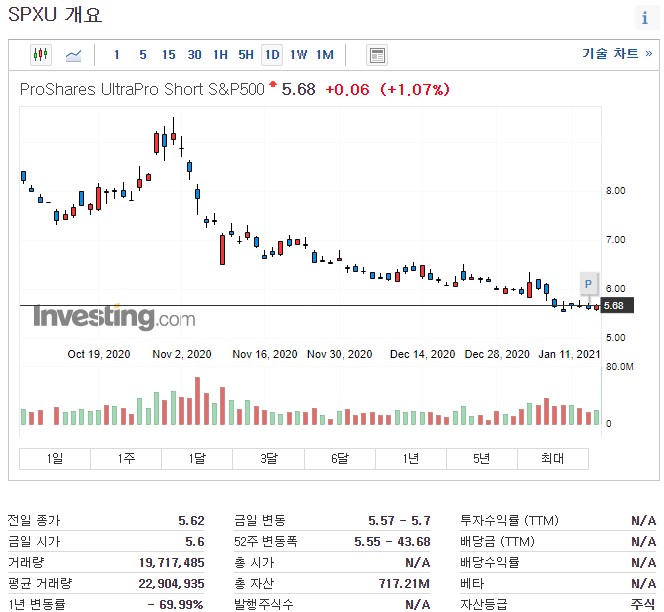 ●ProShares UltraPro Short S&P500 (티커명 : SPXU) : S&P500 지수 추종 인버스 ETF 3X