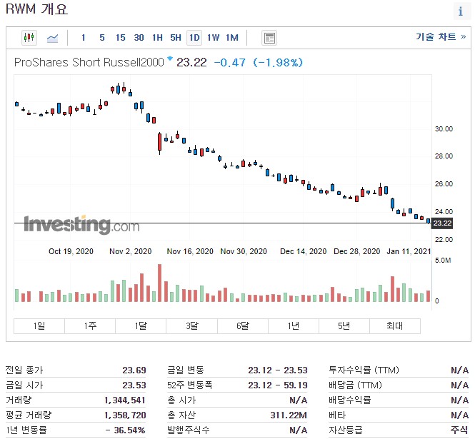 ●ProShares Short Rusell2000 (티커명 : RWM) : 러셀2000 지수 인버스 ETF 1X