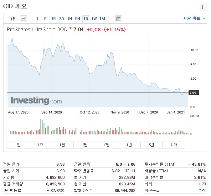 ●ProShares Ultra Short QQQ (티커명 : QID) : 나스닥 종합지수 추종 인버스 ETF 2X