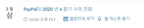 페이팔의 3분기 실적의 경우 코로나의 수혜를 제대로 받아버린 모습을 보실 수 있습니다. 자택 대기 기간이 늘어남에 따라 온라인 결제의 서비스를 이용하는 사람들이 매우 늘어난 게 페이팔의 어닝서프라이즈의 원동력이 되어주었습니다. 추가로 20년 4분기 실적의 경우 2021년 2월 3일 발표 예정입니다.